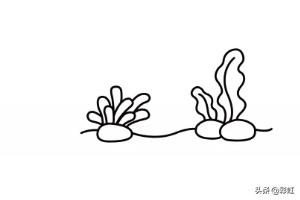 1、首先我们要在画一个圆圆的石头,然后在上面画出倒U形的小珊瑚。接着我们在它的右边再画两个石子,然后画出浮动的海草。最后在画一条横线把石子连接起来成为海床。