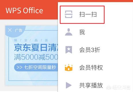 6、接着使用手机上的WPS,在菜单选项中选择”扫一扫“功能选项,扫描电视端WPS提供的二维码进行连接。