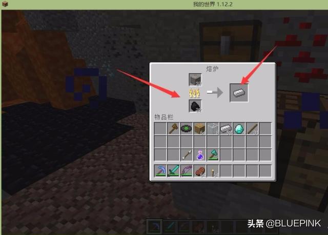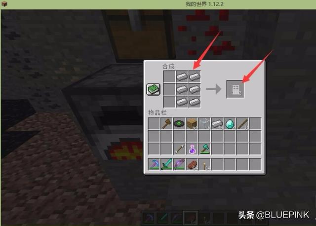 第二步,烧得铁锭之后(至少需要6个铁锭),在工作台中,3个铁锭一列,共放置两列合成一个铁门。