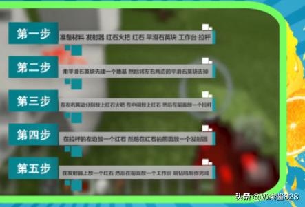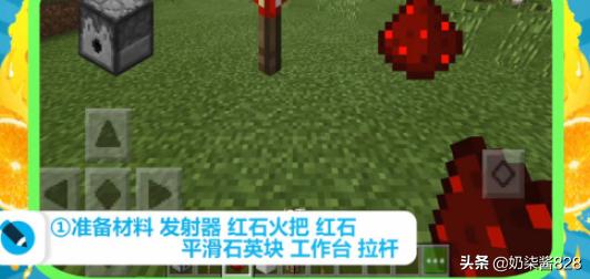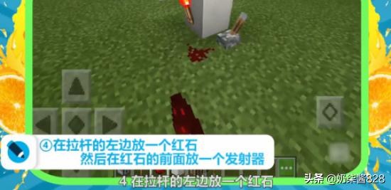 4、在拉杆左边放一个红石,在红石前面放一个发射器。