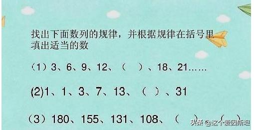 隔项题型:隔项题型的特点主要是隔项数字与数字之间的加数相等或具有一定的规律,请看下面的例题:3、2、5、2、7、2()() 从这一题我们能够看出隔项数字之间的加数为2,即3+2=5 、5+2=7、7+2=9 ,这里要注意以下第二个括号内要填2而不是11。