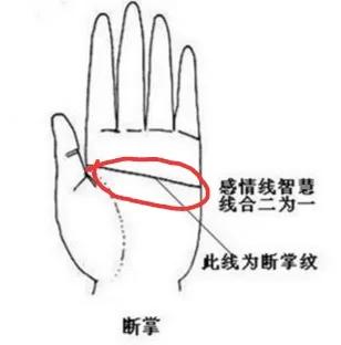 所谓“断掌”並不是说手掌折断,是指手纹。如果手纹中感情线和智慧线重迭在一起,形成一条横线贯穿手掌,似乎把手掌分为两部分。有这样手纹的手,称之为“断掌”。