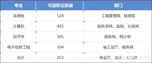 从表中我们可以看出法律类,计算机类,经济学,电子信息工程等专业可选择的职位相当多。并且相对照的部门也是比较不错的。(数据仅供参考)
