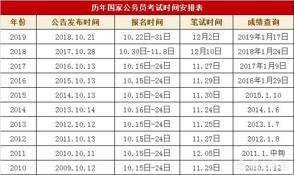 下面,小编为你整理了2010-2019年国家公务员考试报名时间、笔试时间表,供你参考: