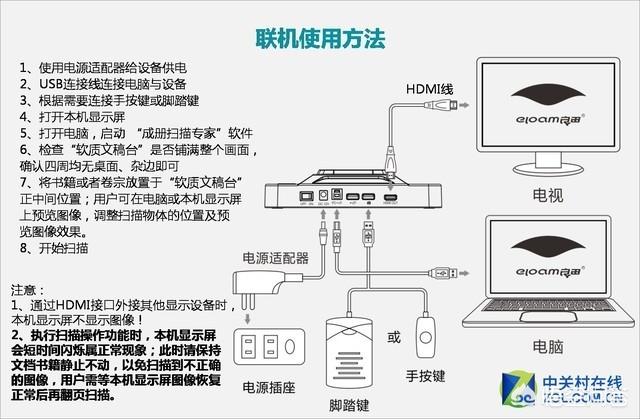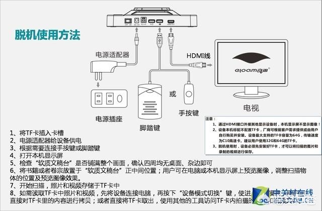 机器的底座上设有补光灯,放大或缩小画面,开始扫描,录像、文本/风景模式切换以及U盘模式切换等简单的操作按钮,可对扫描操作进行简单的设置,并且还可在屏幕上对画面进行预览,十分得便捷。