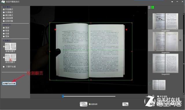 另外作为一台智能的书籍扫描仪器,良田BS2000P支持翻页检测操作,按下“检测翻页自动扫描”按钮后即可进行翻页操作,当机器检测到翻页任务完成后,自动进行扫描拍摄,无需手动辅助拍摄,非常的智能。