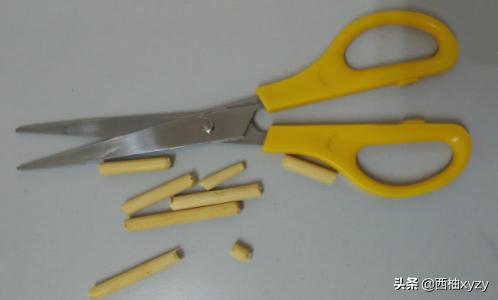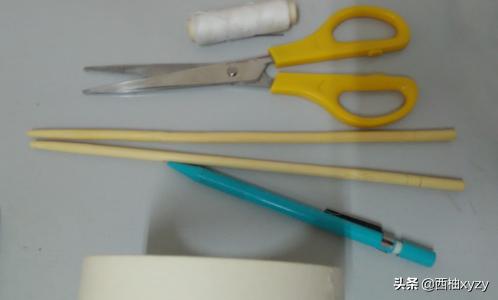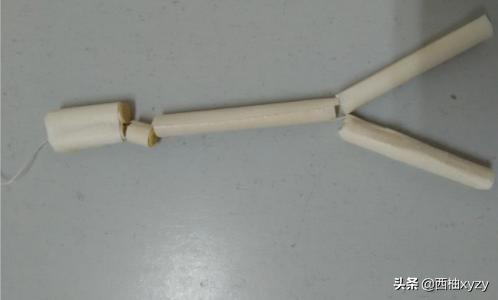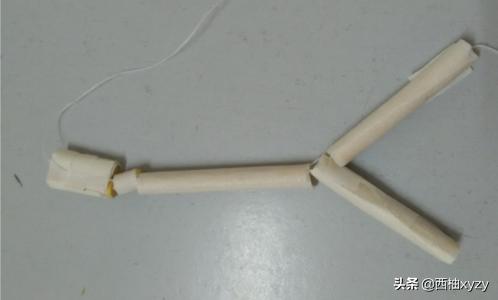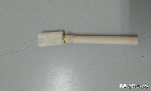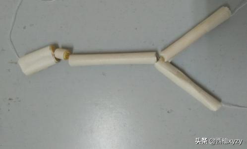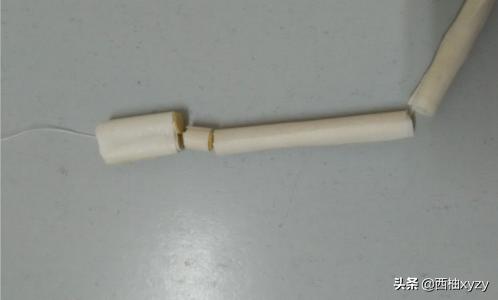 11、然后把线留出一个筷子粗的量,再把另一条胳膊竹节用纸胶带把线卷在里面。粘完后,再留一尺长的线,然后剪断。