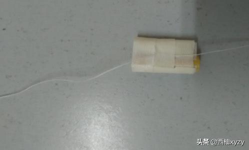 5、再在线轴上抻出一条长约一尺的线,用纸胶带粘在头的后面,粘完不剪断。