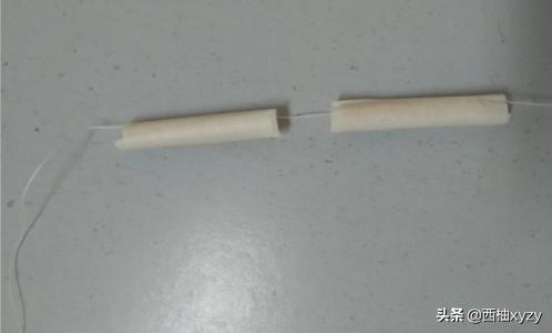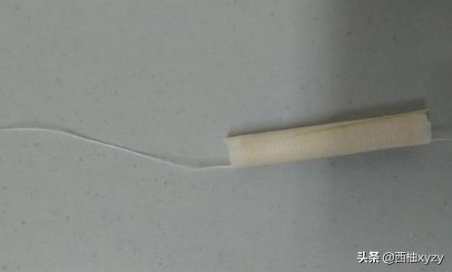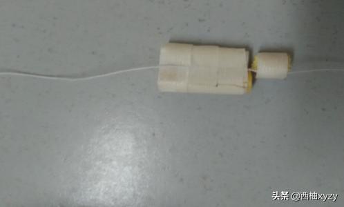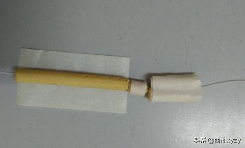 10、另取一条线,先留出一尺长的线头,然后把一条胳膊竹节用纸胶带连同线卷在里面。