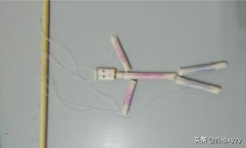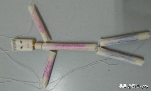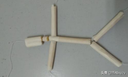 16、最后把竹节小人的头、两只胳膊、两条腿留出的五个一尺长的线,分别绑在另一支竹筷子上面,一个竹节木偶小人就全部完成了,可以提着线,让小人表演各种节目了。