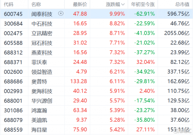 10月31日丨闻泰科技涨停,中石科技、立讯精密涨超8%,冠石科技、捷邦科技等涨超7%。苹果公布的财报显示,Q3营收盈利均超预期,营收901。5亿美元创历史新高。