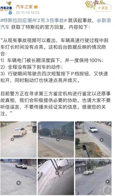 日前,广东潮州一辆特斯拉Model Y在路边停车失败后,狂奔2。6公里并连撞多辆车,最终导致2死3伤。11月13日,车主家属通过社交媒体发声称,车主有20多年驾龄,出事时曾猛踩刹车但未能减速,希望相关部门尽早清楚事故原因。