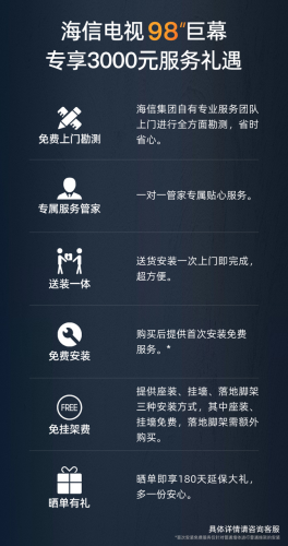 不仅如此,海信电视打通销售、物流、安装等各环节,针对98吋巨幕电视推出定制专属服务。在产品上市前三个月推出最高价值3000元的服务礼包,包括一对一管家服务、免费上门勘测、送货安装一次上门完成、座装墙挂免费等超值服务。值得一提的是,3月31日前购买98E7G-PRO新品的用户还可以享受免费上楼的“上市福利”,免去30元/层的“爬楼费”。