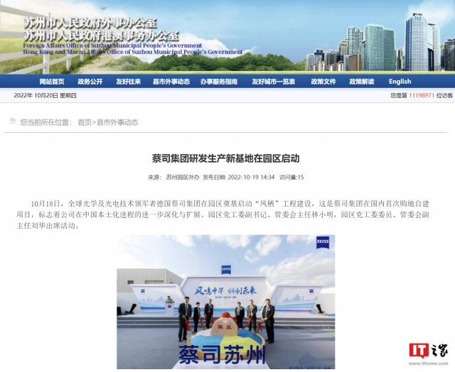 10 月 20 日消息,据苏州市人民外事办公室网站,10 月 18 日,德国蔡司集团在苏州工业园区奠基启动“凤栖”工程建设,这是蔡司集团在国内首次购地自建项目,标志着蔡司在中国本土化进程的进一步深化与扩展。