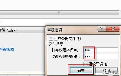 3在弹出的密码设置框上录入打开权限密码和修改权限密码并点确定,两个密码可以设置成不一样,知道打开权限密码的人可以查看但不能修改,这个可以根据你自己的需要进行设置。