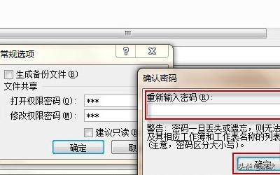 4提示重新输入密码,录入并确定。注意录入的密码为打开权限密码,由于设置了两个密码,提示重新输入密码也会有两次,第二次录入修改权限密码,并保存。