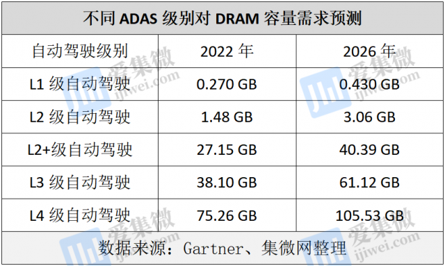 以DRAM为例,存储市场分析师认为,接下来几年,向L2+及更高级别自动驾驶的升级迁移将是车载DRAM的最主要驱动力。目前,配备L2级别自动驾驶系统的汽车大概需要DRAM 1。48GB,到L2+级DRAM需求将大幅提升到27。15GB。今年以来,随着大算力芯片的量产上车,汽车智能驾驶系统向L2+、L3级别升级,对DRAM的需求会明显提升,预计车载DRAM在整个DRAM市场的营收占比有望从2021年的2。4%,大幅提升到2026年的10%。