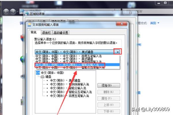 5、现在就进入了“文本服务和输入语言”的设置框,输入法就在这里进行设定,点击右侧的下拉图标,在下面选择你需要设为默认的输入法,然后点击确定即可。