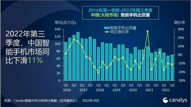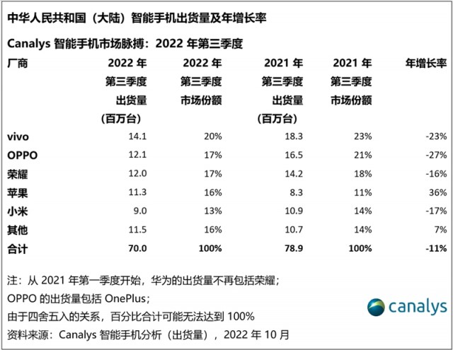 今日,科技市场独立分析机构Canalys发布了2022年第三季度中国大陆智能手机市场表现数据。