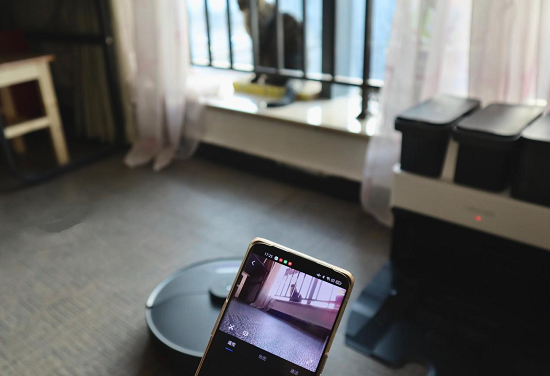 在实际测试中,虽然石头自清洁扫拖机器人G10S Pro在地面上,但在拍摄的时候,对离地面约40cm高的阳台上趴着小猫咪照样都可以拍摄清晰。另外出门在外,还可以通过石头的深邃的“大眼睛”,查看家中状况以及宠物是否正在淘气。