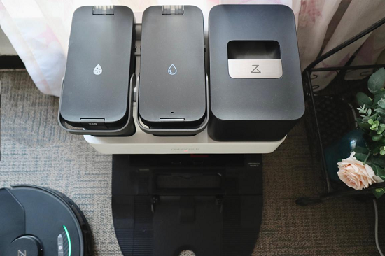 除了自集尘尘盒,基站还自带一个清水箱,一个废水箱。后者用于收纳清洁废水,而前者不仅可以用于自清洁,还能实现扫地机电控水箱的自动补水,日常使用时注意清空污水箱,及时给净水箱补水即可。同时,基站自身也会清洁,将底座等部位的污水刮净,全数收纳进污水箱。而洗干净的拖布,在充电时外置,悬空晾干。也可选配烘干桩,直接烘干。