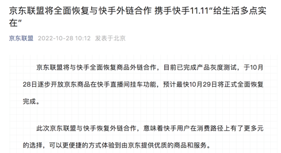 10月28日,京东联盟微信公众号宣布将与快手全面恢复商品外链合作,目前已完成产品灰度测试,于10月28日逐步开放京东商品在快手直播间挂车功能,预计最快10月29日将正式全面恢复完成。