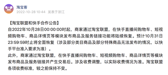 与此同时,淘宝联盟微信公众号也宣布,自10月28日起商家通过淘宝联盟,在快手直播间购物车、短视频购物车、商品详情页等模块发布商品及服务链接功能将陆续恢复,预计10月31日将全面恢复。
