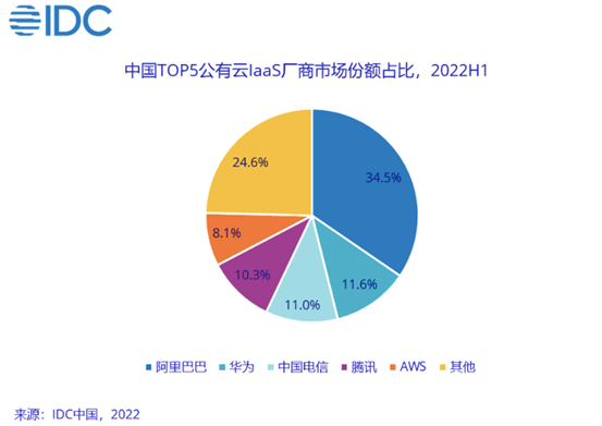 其中,IaaS市场,阿里、华为、中国电信、腾讯、AWS(亚马逊云科技)份额依次排名前五。