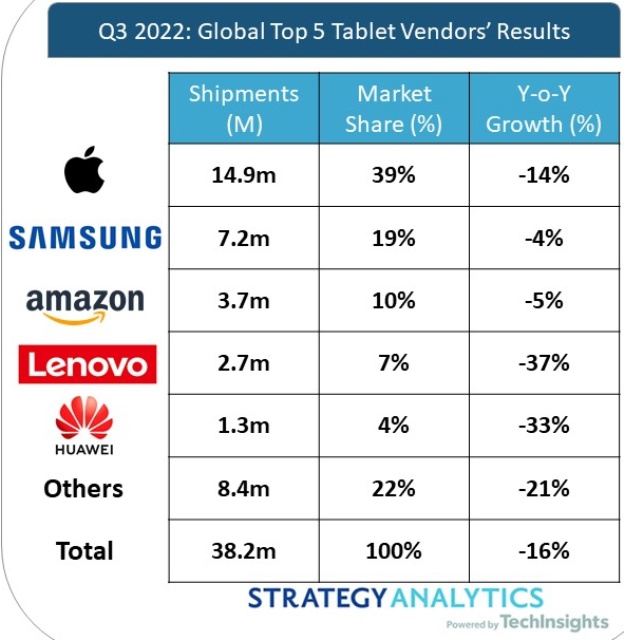 10 月 31 日消息,根据 Strategy Analytics 的数据,2022 年第三季度全球平板电脑市场的出货量下降了 16%,至 3820 万台。