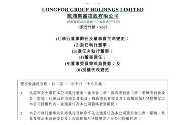 10月28日晚间,龙湖集团发布人事变动公告。公告显示,吴亚军因个人年龄及身体原因而呈请辞任公司执行董事、董事会主席、提名委员会主席、薪酬委员会委员、环境、社会及管治委员会委员、投资委员会委员及公司授权代表,并获委任为公司战略发展顾问,自2022年10月28日生效。